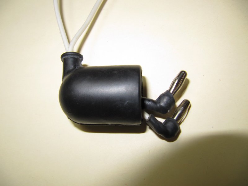 Talk about a redneck repair--there's no connector! The wire has simiply been bunched up and stuck into the socket. The split in the hood obviously prevents it from staying in place, so it was held on by a zip tie. This also serves as an example why electrical tape doesn't work in cars--what a mess!