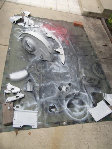 This is probably the hardest piece of ductwork to restore. Removing all the paint is a real pain. I used a chemical paint remover to take off the old coating, but it still had to be scraped, and access to all the nooks and crannies is difficult. Also, for some reason, in places the paint did not have its expected glossy appearance. You can see the problem in this picture on the left side of the unit. I had to wait for the paint to cure, sand it lightly, and spray another coat. Once it's dry, I'll reinstall the control levers and spring. (I used high-temperature brake caliper paint for this piece, the heat exchangers, and the valve covers. I used a better-looking paint for the other parts.)