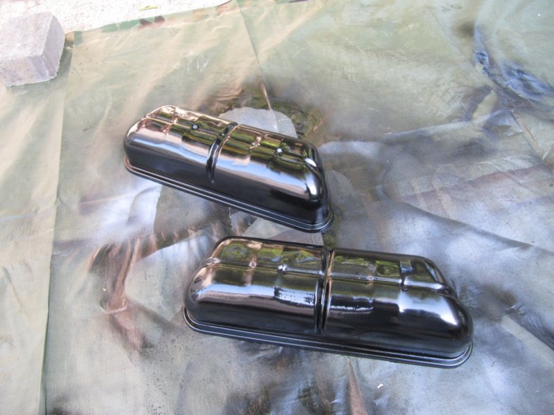 These could be stripped almost completely by simply peeling off the old coating. The inside was not peeling, but its coating could be removed easily with a little scraping. Many of the sheet metal bits could be stripped similarly, by just peeling off the old powder coating. Most of the sheet metal bits looked like this, with a greater or lesser amount of rust speckling. It required only a light sanding to take off any loose rust.